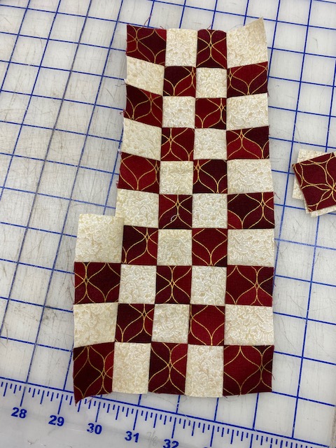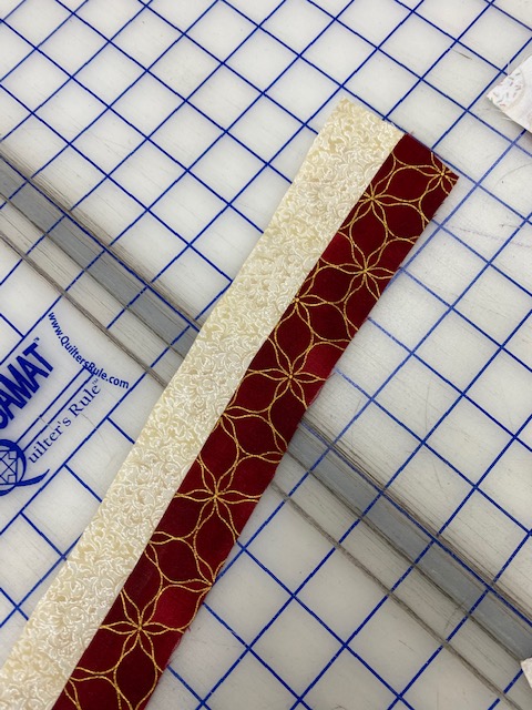 Sew the 1 1/2″ strips together using a 1/4″ seam. Press to the dark. Cut strip into 1 1/2″ sections to yield at least 22″ pieces.