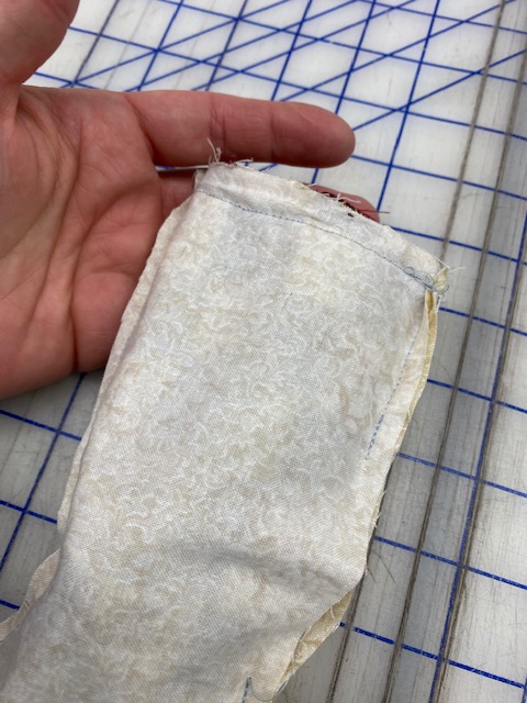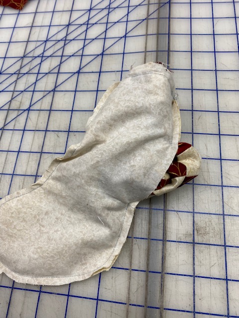 Turn Right side through the side hole in the lining. Hand sew the lining hole shut. Press Well.