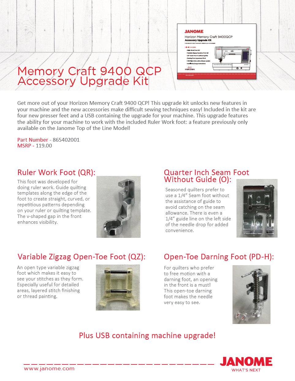 We have fantastic news for all Janome Horizon MC 9400 customers. You can now get even more out of your machine with the all new Accessory Upgrade Kit…