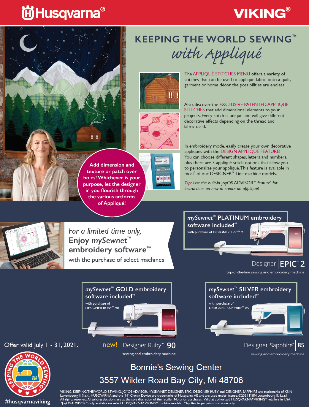 Husqvarna Viking is offering mysewnet subscriptions FREE with a purchase of the following machines!