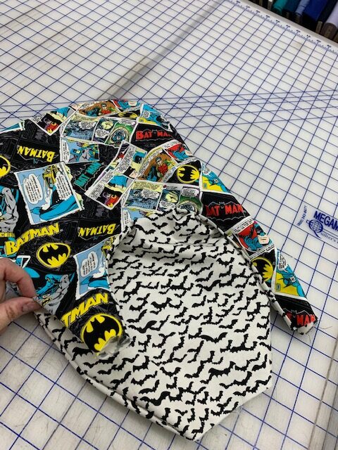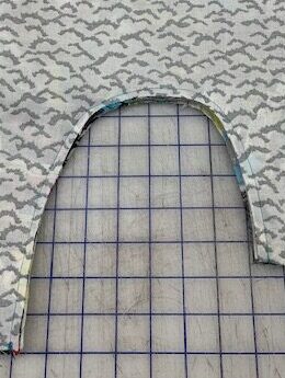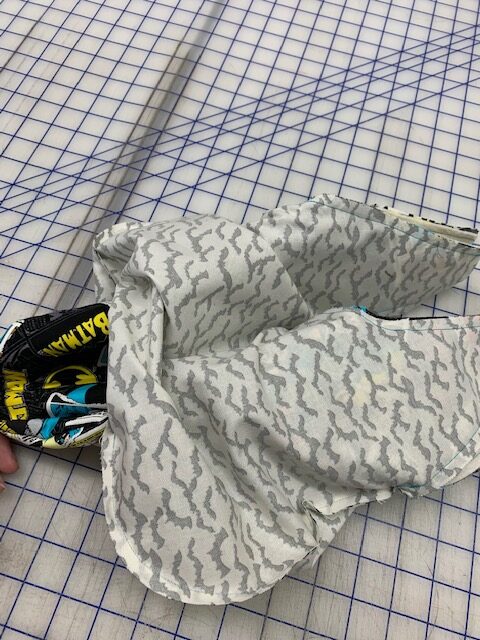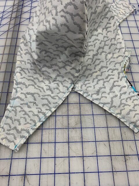Put the two lining bag pieces right sides together, making sure to line up the pivot marks. Sew from pivot mark to pivot mark, making sure to leave an opening at the bottom of the bag for turning as noted on bag template. Clip the curve along the bottom of the bag.