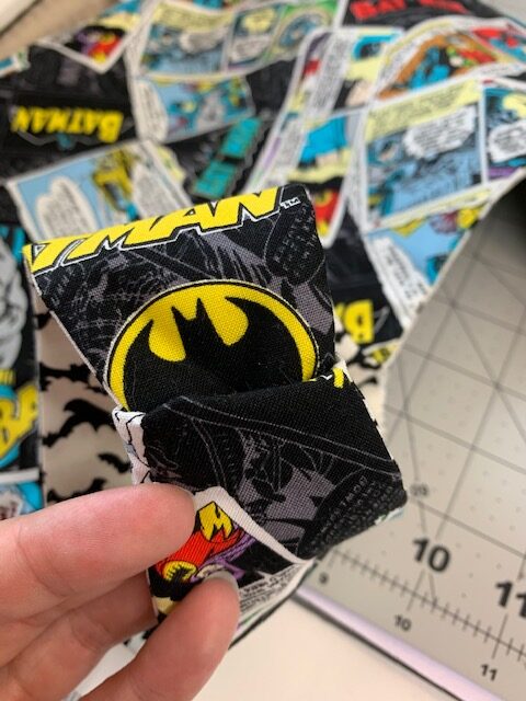 Turn one of the front long handles in 3/8″-1/2″ and press well. Tuck the raw edges of the back long handle inside of the front handle and sew across to secure. Repeat for the short handle.