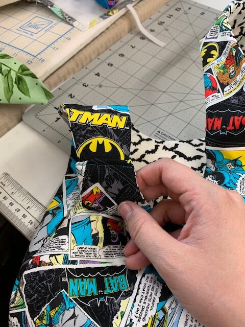 Carefully sew the outer curves of the handles, making sure to stop at the pivot point and backstitching. You will sew each side of the handles (top of front handle to pivot point, stop, take out of maching, move bag body out of the way, then sew from the other side of the pivot point, to the top of the back handle). Repeat for both sides of the handles.