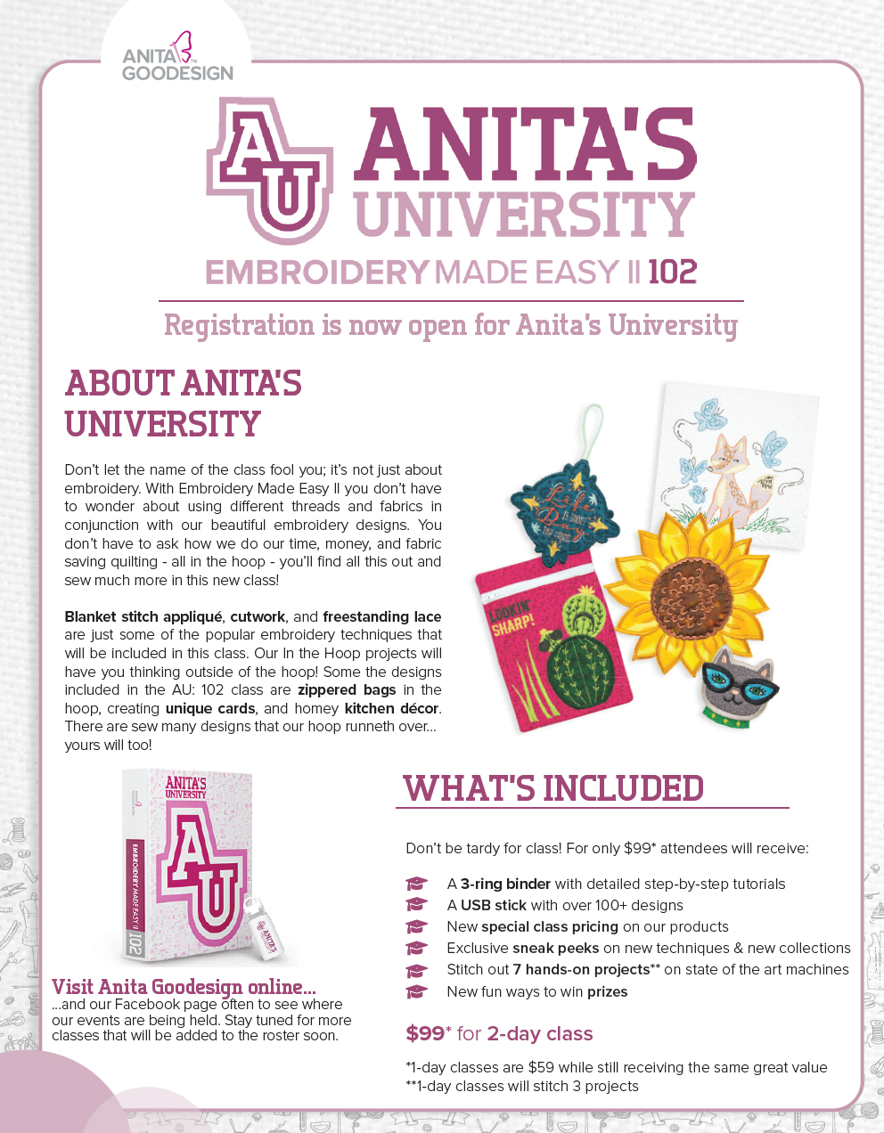We are PLEASED to ANNOUNCE our return to Anita’s University by Anita Goodesign.