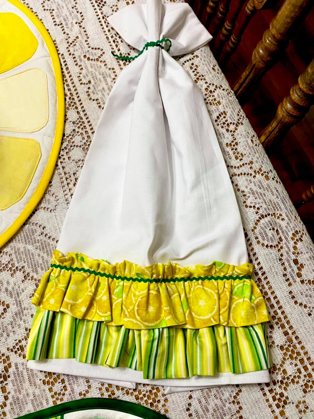The second week of our lemon and lime kitchen set will be a Lemon or Lime Tabletopper. You can make it a 20″ table topper or a 16″ table topper. It is so fresh and clean looking. It is bound to spice up any dining room!