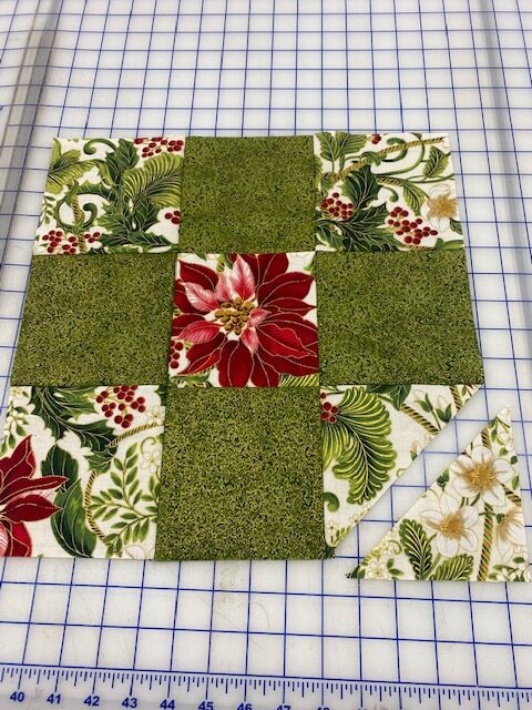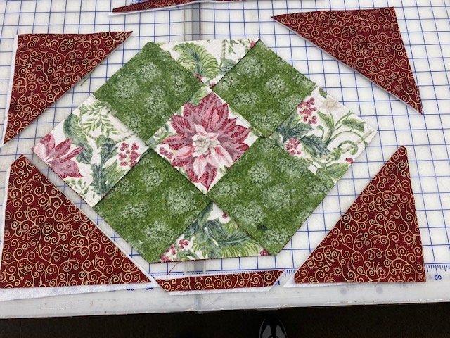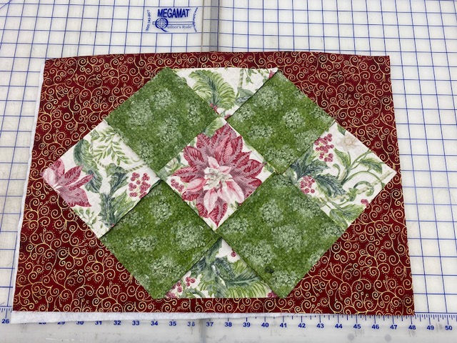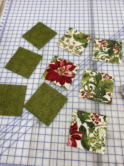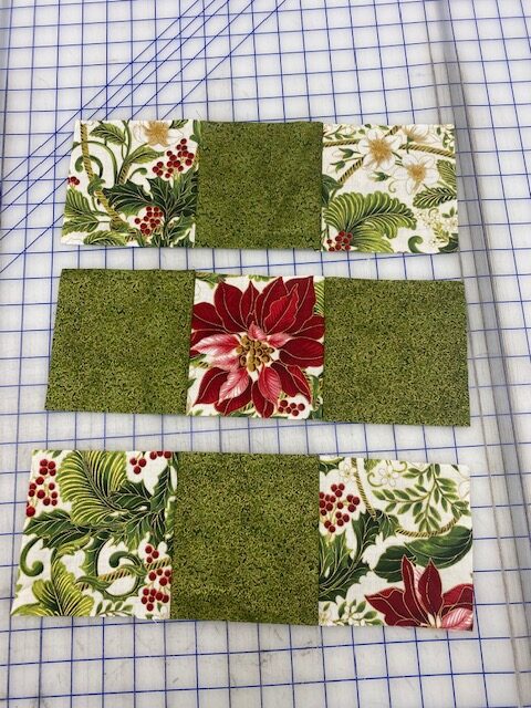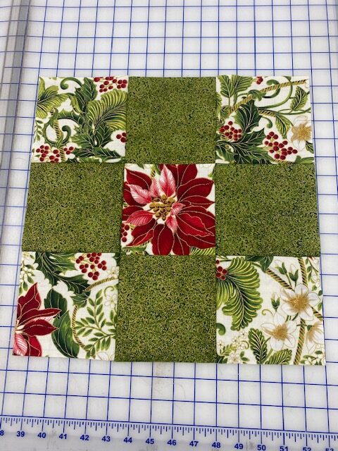 Lay the squares out to your liking in a 3 x 3 grid. You can use 9 different squares if you choose. In the sample, I used two fabrics 5 squares of the print and 4 squares of green.
