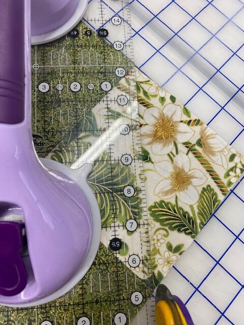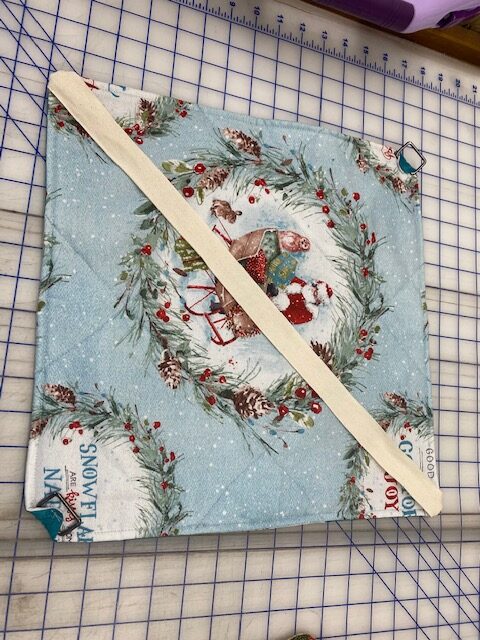 For the placemat, lay your ruler on one of the corner squares from seam to seam and trim as show below.