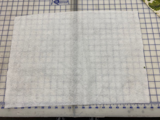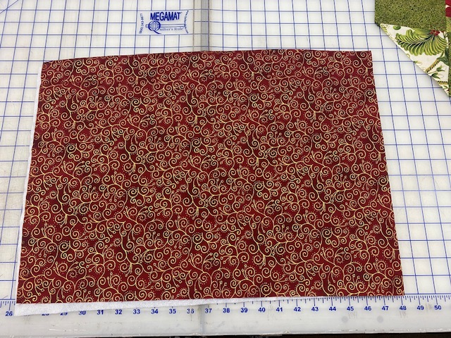 Set the top aside and lay the batting on the table. Then layer the backing fabric on the table right side up. Lastly layer the top of the placement on top wrong side up.