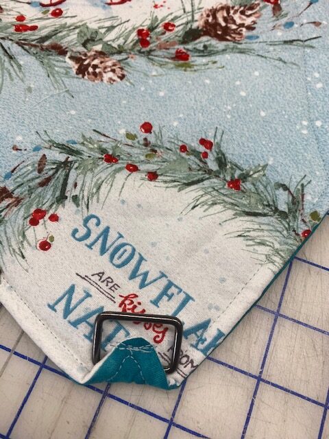 Instead of cutting the corners off the 9 patch leave it whole (If using 6 1/2″ squares your nine patch should be 18 1/2″ x 18 1/2″). Instead of batting, use insulbrite (You can use one layer of insulbrite and one layer of cotton batting if you plan on using it with hot items). Trim your insulbrite and backing to 18 1/2″ x 18 1/2″. Lay the insulbrite on the table. Lay the backing fabric on top right side up. Lay a piece of twill tape or strapping across the backing from corner to corner and pin in place. Lay the nine patch on top wrong side up. Sew all the way around using 1/4″ seam, leaving a hole for turning. Turn right side out and press. Hand sew the opening closed. Top stitch all the way around and quilt as desired. On the opposite corners (the ones without the strap), lay a D ring, rectangle ring, or O ring down and flip the corner over the ring to encase the edge. Using a zipper foot sew as close to the ring as possible (triple stitch). And Done!