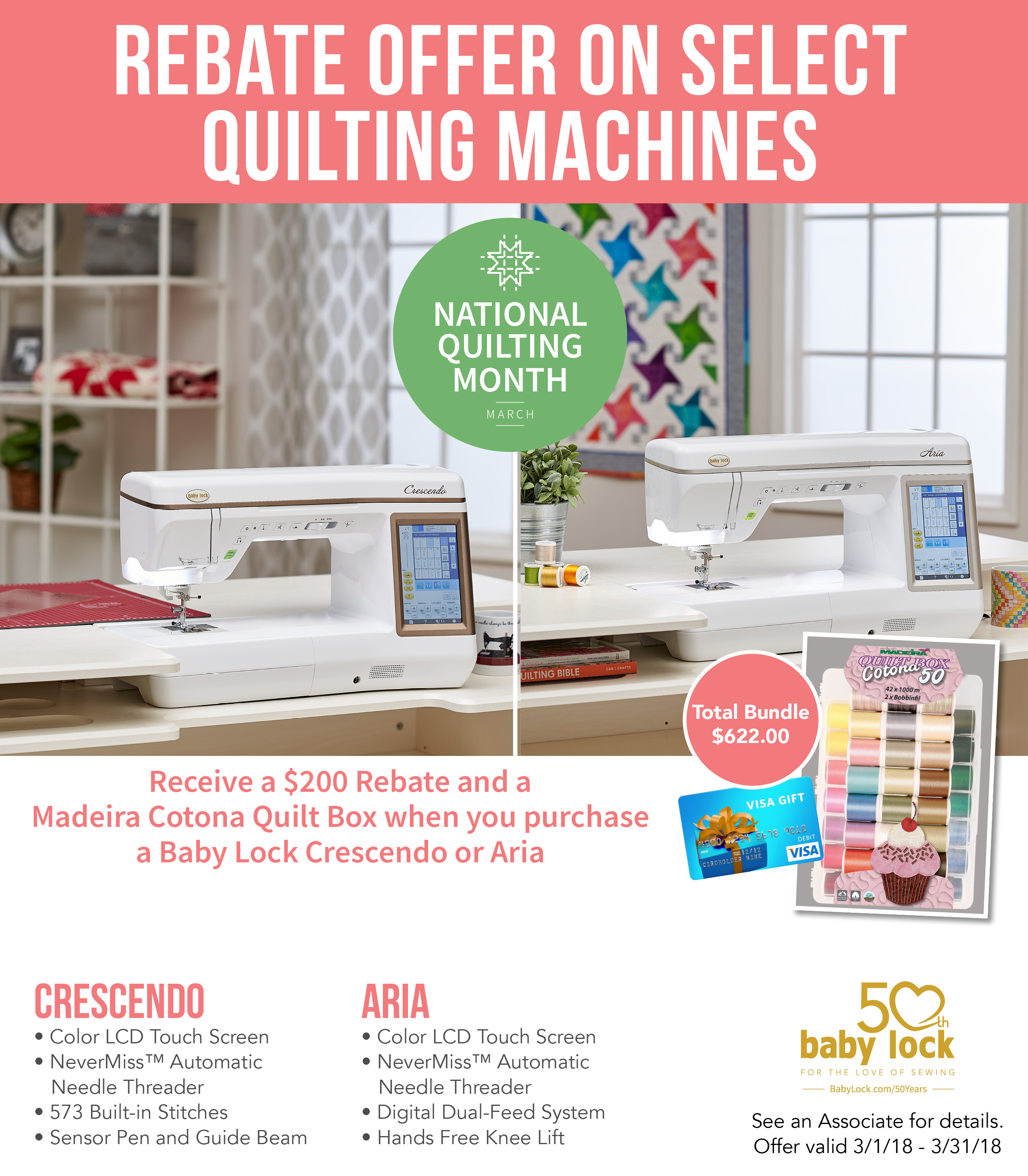 For national quilting month if you purchase the Baby Lock Crescendo or Aria you will receive a $200 rebate as well as …
